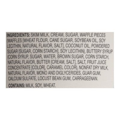 INGREDIENTS: Skim Milk, Cream, Sugar, Waffle Pieces (Waffles [Wheat Flour, Cane Sugar, Soybean Oil, Soy Lecithin, Natural Flavor, Salt], Coconut Oil, Powdered Sugar [Sugar, Corn Starch], Soy Lecithin), Buttery Syrup (Corn Syrup, Sugar, Water, Brown Sugar, Corn Starch, Natural Flavor, Butter [Cream, Salt], Salt, Fruit Juice Concentrate [Color], Caramel Color), Nonfat Dry Milk, Natural Flavor, Mono and Diglycerides, Guar Gum, Calcium Sulfate, Locust Bean Gum, Carrageenan.