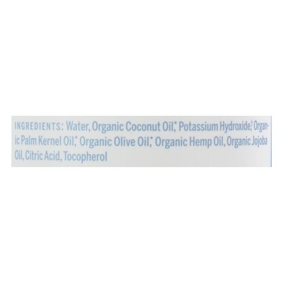 INGREDIENTS: Water, Organic Coconut Oil (Certified Fair Trade Ingredients), Organic Palm Kernel Oil (Certified Fair Trade Ingredients), Potassium Hydroxide (None Remains After Saponifying Oils Into Soap & Glycerin), Organic Olive Oil (Certified Fair Trade Ingredients), Organic Hemp Seed Oil, Organic Jojoba Oil, Citric Acid, Tocopherol.