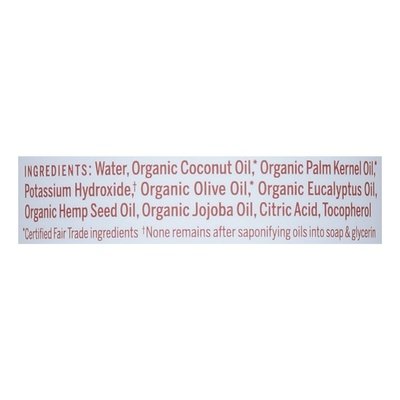 INGREDIENTS: Water, Organic Coconut Oil (Certified Fair Trade Ingredients), Organic Palm Kernel Oil (Certified Fair Trade Ingredients), Potassium Hydroxide (None Remains After Saponifying Oils Into Soap & Glycerin), Organic Olive Oil (Certified Fair Trade Ingredients), Organic Eucalyptus Oil, Organic Hemp Seed Oil, Organic Jojoba Oil, Citric Acid, Tocopherol.