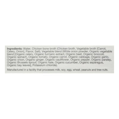 INGREDIENTS: Water, Chicken Bone Broth (Chicken Broth, Vegetable Broth [Carrot, Celery, Onion], Flavor, Salt), Vegetable Blend (White Onion Powder, Organic Vegetable Blend [Organic Celery, Organic Turmeric Extract, Organic Beet, Organic Broccoli, Organic Spinach, Organic Tomato, Organic Carrot, Organic Cabbage, Organic Garlic, Organic Onion, Organic Ginger, Organic Cauliflower, Organic Pepper, Organic Parsley, Organic Brussels Sprout, Organic Kale, Organic Cucumber, Organic Asparagus, Organic Bay Leaves], Potassium Chloride).