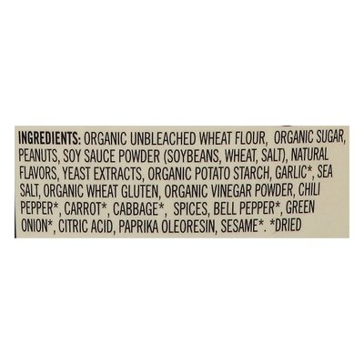 INGREDIENTS: Organic Unbleached Wheat Flour, Organic Sugar, Peanuts, Soy Sauce Powder (Soybeans, Wheat, Salt), Natural Flavors, Yeast Extracts, Organic Potato Starch, Garlic (Dried), Sea Salt, Organic Wheat Gluten, Organic Vinegar Powder, Chili Pepper (Dried), Carrot (Dried), Cabbage (Dried), Spices, Bell Pepper (Dried), Green Onion (Dried), Citric Acid, Paprika Oleoresin, Sesame (Dried).