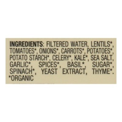 INGREDIENTS: Filtered Water, Lentils (Organic), Tomatoes (Organic), Onions (Organic), Carrots (Organic), Potatoes (Organic), Potato Starch (Organic), Celery (Organic), Kale (Organic), Sea Salt, Garlic (Organic), Spices (Organic), Basil (Organic), Sugar (Organic), Spinach (Organic), Yeast Extract, Thyme (Organic).
