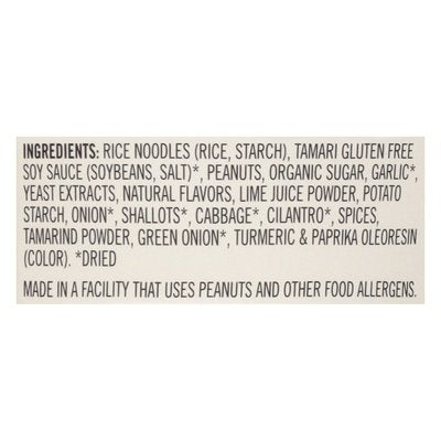 INGREDIENTS: Rice Noodles (Rice, Starch), Tamari Gluten Free Soy Sauce (Soybeans, Salt) (Dried), Peanuts, Organic Sugar, Garlic (Dried), Yeast Extracts, Natural Flavors, Lime Juice Powder, Potato Starch, Onion (Dried), Shallots (Dried), Cabbage (Dried), Cilantro (Dried), Spices, Tamarind Powder, Green Onion (Dried), Turmeric & Paprika Oleoresin (Color).