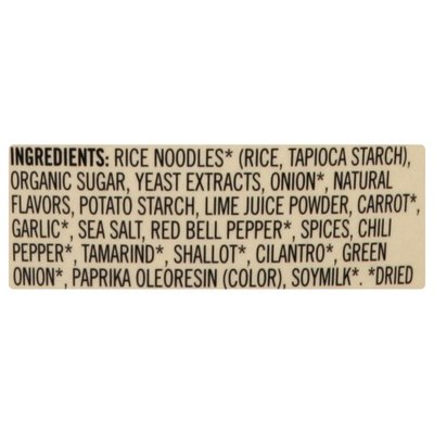 INGREDIENTS: Rice Noodles (Dried) (Rice, Tapioca Starch), Organic Sugar, Yeast Extracts, Onion (Dried), Natural Flavors, Potato Starch, Lime Juice Powder, Carrot (Dried), Garlic (Dried), Sea Salt, Red Bell Pepper (Dried), Spices, Chili Pepper (Dried), Tamarind (Dried), Shallot (Dried), Cilantro (Dried), Green Onion (Dried), Paprika Oleoresin (Color), Soymilk (Dried).