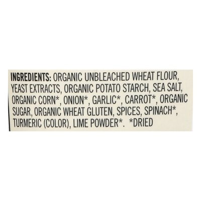 INGREDIENTS: Organic Unbleached Wheat Flour, Yeast Extracts, Organic Potato Starch, Corn (Dried), Onion (Dried), Garlic (Dried), Carrot (Dried), Organic Sugar, Organic Wheat Gluten, Spices, Spinach (Dried), Turmeric (Color), Lime Powder (Dried).