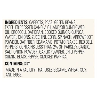 INGREDIENTS: Carrots, Peas, Green Beans, Expeller Pressed Canola Oil and/or Sunflower Oil, Broccoli, Oat Bran, Cooked Quinoa (Quinoa, Water), Onions, Zucchini, Corn, Spinach, Arrowroot Powder, Oat Fiber, Edamame, Potato Flakes, Red Bell Peppers, Contains Less than 2% of Parsley, Garlic, Salt, Onion Powder, Garlic Powder, Chili Pepper, Cumin, Black Pepper, Smoked Paprika.