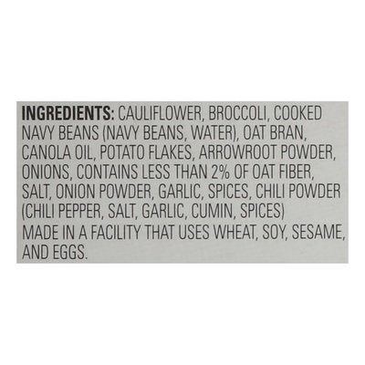 INGREDIENTS: Cauliflower, Broccoli, Cooked Navy Beans (Navy Beans, Water), Oat Bran, Canola Oil, Potato Flakes, Arrowroot Powder, Onions, Contains Less than 2% of Oat Fiber, Salt, Onion Powder, Garlic, Spices, Chili Powder (Chili Pepper, Salt, Garlic, Cumin, Spices)