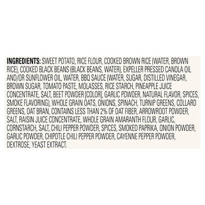 INGREDIENTS: Sweet Potato, Rice Flour, Cooked Brown Rice (Water, Brown Rice), Cooked Black Beans (Black Beans, Water), Expeller Pressed Canola Oil and/or Sunflower Oil, Water, BBQ Sauce (Water, Sugar, Distilled Vinegar, Brown Sugar, Tomato Paste, Molasses, Rice Starch, Pineapple Juice Concentrate, Salt, Beet Powder [Color], Garlic Powder, Natural Flavor, Spices, Smoke Flavoring), Whole Grain Oats, Onions, Spinach, Turnip Greens, Collard Greens, Oat Bran, Contains Less than 2% of Oat Fiber, Arrowroot Powder, Salt, Raisin Juice Concentrate, Whole Grain Amaranth Flour, Garlic, Cornstarch, Salt, Chili Pepper Powder, Spices, Smoked Paprika, Onion Powder, Garlic Powder, Chipotle Chili Pepper Powder, Cayenne Pepper Powder, Dextrose, Yeast Extract.
