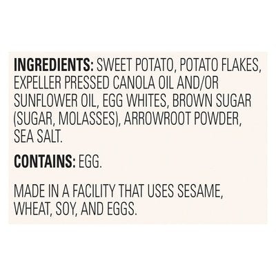 INGREDIENTS: Sweet Potato, Potato Flakes, Expeller Pressed Canola Oil and/or Sunflower Oil, Egg Whites, Brown Sugar (Sugar, Molasses), Arrowroot Powder, Sea Salt.