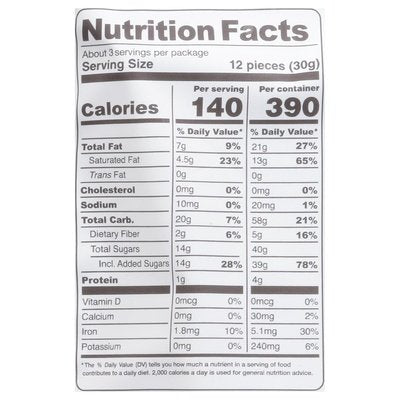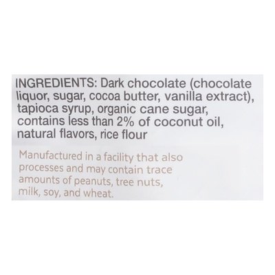 INGREDIENTS: Dark Chocolate (Chocolate Liquor, Sugar, Cocoa Butter, Vanilla Extract), Tapioca Syrup, Organic Cane Sugar, Contains Less than 2% of Coconut Oil, Natural Flavors, Rice Flour.