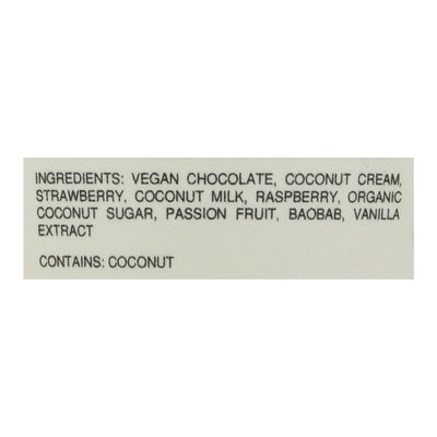 INGREDIENTS: Vegan Chocolate, Coconut Cream, Strawberry, Coconut Milk, Raspberry, Organic Coconut Sugar, Passion Fruit, Baobab, Vanilla Extract.