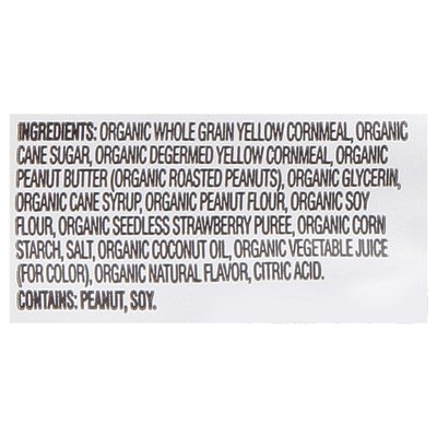 INGREDIENTS: Organic Whole Grain Yellow Cornmeal, Organic Cane Sugar, Organic Degermed Yellow Cornmeal, Organic Peanut Butter (Organic Roasted Peanuts), Organic Glycerin, Organic Cane Syrup, Organic Peanut Flour, Organic Soy Flour, Organic Seedless Strawberry Puree, Organic Corn Starch, Salt, Organic Coconut Oil, Organic Vegetable Juice (for Color), Organic Natural Flavor, Citric Acid.