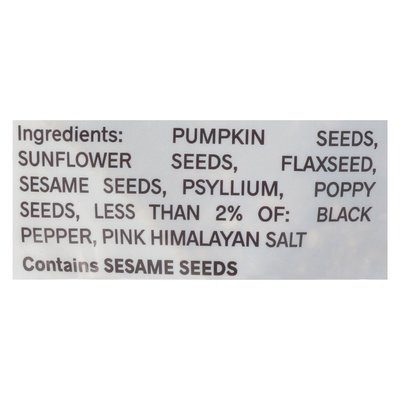 INGREDIENTS: Pumpkin Seeds, Sunflower Seeds, Flaxseed, Sesame Seeds, Psyllium, Poppy Seeds, Less than 2% of: Black Pepper, Pink Himalayan Salt.