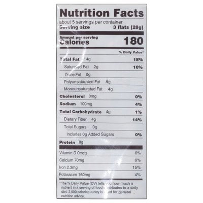 PRODUCT DETAILS: 0 mg net carbs (Per serving). Omega 3 - 1.09 grams/serving; Omega 6 - 6.75 grams/serving; Omega 9 - 4.12 grams/serving. Certified gluten free. Vegan. Paleo. Keto. Good source fiber (Per serving). Grain free. Sugar free ( per serving) Non-GMO Project verified. nongmoproject.org. Love what you're eating. All seed. Plant based whole food. Crunchy gluten-free fiber! Scrumptious for breakfast, lunch, dinner, snacks & cocktails with pink Himalayan salt. No preservatives simple food. www.ellasflats.com. Facebook. Instagram. (at)ellasflats. Visit us for more updates and locations. Enjoy all of our Ella's Flats flavors - also available in convenient grab'n go snack packs! Sesame Original Recipe. Hemp. Caraway. Cumin. Everything. Resealable bag. Made in Sunny Florida.