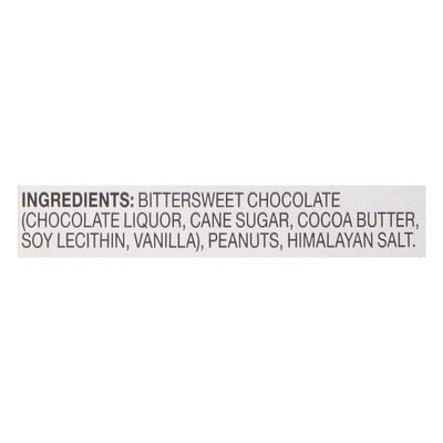 INGREDIENTS: Bittersweet Chocolate (Chocolate Liquor, Cane Sugar, Cocoa Butter, Soy Lecithin, Vanilla), Peanuts, Himalayan Salt.