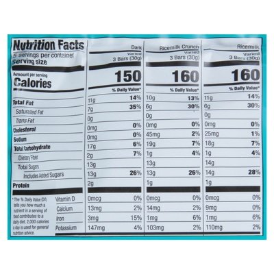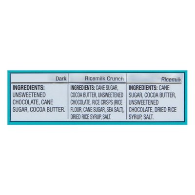 INGREDIENTS: Dark: Unsweetened Chocolate, Cane Sugar, Cocoa Butter. Ricemilk Crunch: Cane Sugar, Cocoa Butter, Unsweetened Chocolate, Rice Crisps (Rice Flour, Cane Sugar, Sea Salt), Dried Rice Syrup, Salt. Ricemilk: Cane Sugar, Cocoa Butter, Unsweetened Chocolate, Dried Rice Syrup, Salt.