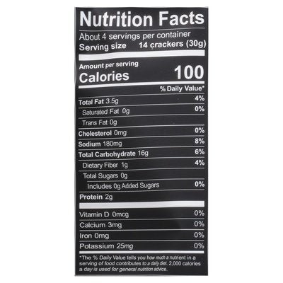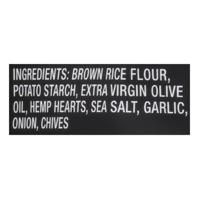 INGREDIENTS: Brown Rice Flour, Potato Starch, Extra Virgin Olive Oil, Hemp Hearts, Sea Salt, Garlic, Onion, Chives.
