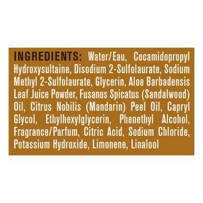INGREDIENTS: Aqua/Water, Cocamidopropyl Hydroxysultaine, Decyl Glucoside, Cocoamidopropyl Betaine, PEG-150 Distearate, Glycerin, Cocamide Med, PPG-5-Ceteth-10 Phosphate, Coco-Glucoside, Glyceryl Oleate, Aloe Barbadensis Leaf Juice, Lavandula Angustifolia (Lavender) Flower Extract, Chamomilla Recutita (Matricaria) Flower Extract Saponaria Officinalis Leaf Extract, Polyquaternium-1, Hydrolyzed Quinoa, Caprylic/Capric Triglyceride, Dimethicone Copolyol, Bisabolol, Fusanus Spicatus Wood (Sandalwood) Oil, Phenoxyethanol, Ethylhexylglycerin, Sodium Benzoate, Potassium Sorbate, Benzyl Alcohol, Linalool, Limonene-D, Fragrance/Parfum.