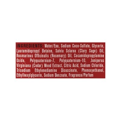 INGREDIENTS: Aqua/Water/Eau, Sodium Coco-Sulfate, Glycerin, Lauramidopropyl Betaine, Cocamidopropylamine Oxide, Salvia Sclarea (Clary Sage) Oil, Rosmarinus Officinalis (Rosemary) Oil, Polyquaternium-7, Polyquaternium-10, Juniperus Virginiana Wood Extract, PEG-40 Hydrogenated Castor Oil, Citric Acid, Ethylhexylglycerin, Phenoxyethanol, Sodium Benzoate, Potassium Sorbate, Linalool, Fragrance/Parfum, Hexyl Cinnamic Aldehyde, Linalool.