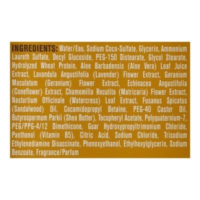 INGREDIENTS: Water/Eau, Sodium Coco-Sulfate, Glycerin, Ammonium Laureth Sulfate, Decyl Glucoside, PEG-150 Distearate, Glycol Stearate, Hydrolyzed Wheat Protein, Aloe Barbadensis (Aloe Vera) Leaf Juice Extract, Lavandula Angustifolia (Lavender) Flower Extract, Geranium Maculatum (Geranium) Flower Extract, Echinacea Angustifolia (Coneflower) Extract, Chamomilla Recutita (Matricaria) Flower Extract, Nasturtium Officinale (Watercress) Leaf Extract, Fusanus Spicatus (Sandalwood) Oil, Cocamidopropyl Betaine, PEG-40 Castor Oil, Butyrospermum Parkii (Shea Butter), Tocopheryl Acetate, Polyquaternium-7, PEG/PPG-4/12 Dimethicone, Guar Hydroxypropyltrimonium Chloride, Panthenol (Vitamin B5), Citric Acid, Sodium Chloride, Trisodium Ethylenediamine Disuccinate, Phenoxyethanol, Ethylhexylglycerin, Sodium Benzoate, Fragrance/Parfum.