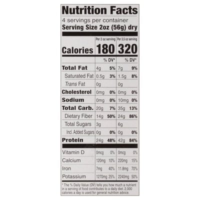 PRODUCT DETAILS: 42 g protein per 3.5 oz serving. Compare 3.5 oz / 100 g serving: Protein; Explore Cuisine Edamame: 42 g; Average wheat-based pasta: 13 g. Compare 3.5 oz / 100 g serving: Dietary fiber; Explore Cuisine Edamame: 24 g; Average wheat-based pasta: 3 g. Compare 3.5 oz / 100 g serving: Net carbs (Net carbs = total carbohydrates - fiber); Explore Cuisine Edamame: 11 g; Average wheat-based pasta: 71 g. Certified Gluten-Free. USDA Organic. Vegan. Non-GMO Project verified. nongmoproject.org. A smarter way to pasta. www.explorecuisine.com. (hashtag)explorecuisine. Share your recipes with us; Facebook; Instagram; Pinterest; YouTube; (at)explorecuisine. Explore cuisine searches the globe to bring you healthy foods! We love to explore and discover innovative, organic foods that are delicious, simple to prepare, colorful and bring plant-based goodness to all. We believe that healthy foods grow from healthy hands, hearts and lives and are committed to trading fairly and organic farming. Through our Food to Thrive Foundation we provide education and empowerment to communities in the developing world to farm sustainably and to prosper. Made in China.