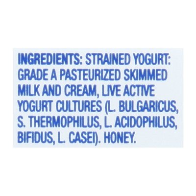 INGREDIENTS: Strained Yogurt: Grade A Pasteurized Skimmed Milk and Cream, Live Active Yogurt Cultures (L. Bulgaricus, S. Thermophilus, L. Acidophilus, Bifidus, L. Casei). Honey.