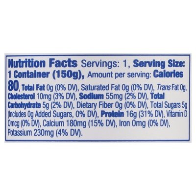 PRODUCT DETAILS: 5 g sugars. 16 g protein. 80 calories. Nonfat. Certified gluten free. gfco.org. 0% milkfat. No added sugar (Contains naturally occurring milk sugar). Non GMO Project verified. nongmoproject.org. Pronounced: Fa-yeh! All natural. Milk produced without the use of rBST. The FDA has said no significant difference has been shown, and no test can now distinguish, between milk derived from rBST treated and untreated cows. Grade A. 1-866-962-5912 Mon.- Fri.