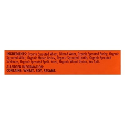 INGREDIENTS: Organic Sprouted Wheat, Filtered Water, Organic Sprouted Barley, Organic Sprouted Millet, Organic Malted Barley, Organic Sprouted Lentils, Organic Sprouted Soybeans, Organic Sprouted Spelt, Yeast, Organic Wheat Gluten, Sea Salt.