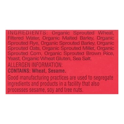 INGREDIENTS: Organic Sprouted Wheat Filtered Water, Organic Malted Barley, Organic Sprouted Rye, Organic Sprouted Garley, Organic Sprouted Oats, Organic Sprouted Millet, Organic Sprouted Corn, Organic Sprouted Brown Rice, Yeast, Organic Wheat Gluten, Sea Salt.