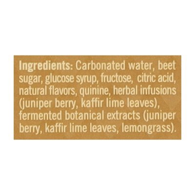 INGREDIENTS: Carbonated Water, Beet Sugar, Glucose Syrup, Fructose, Citric Acid, Natural Flavors, Quinine, Herbal Infusions (Juniper Berry, Kaffir Lime Leaves), Fermented Botanical Extracts (Juniper Berry, Kaffir Lime Leaves, Lemongrass).