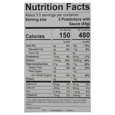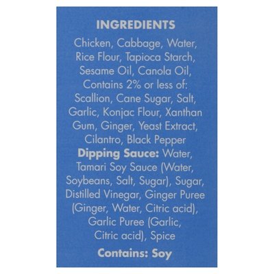 INGREDIENTS: Chicken, Cabbage, Water, Rice Flour, Tapioca Starch, Sesame Oil, Canola Oil, Contains 2% or Less of: Scallion, Cane Sugar, Salt, Garlic, Konjac Flour, Xanthan Gum, Ginger, Yeast Extract, Cilantro, Black Pepper. Dipping Sauce: Water, Tamari Soy Sauce (Water, Soybeans, Salt, Sugar), Sugar, Distilled Vinegar, Ginger Puree (Ginger, Water, Citric Acid) Garlic Puree (Garlic, Citric Acid), Spice.
