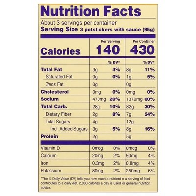 INGREDIENTS: Cabbage, Water, Rice Flour, Onions, Tapioca Starch, Carrots, Vermicelli (Potato Starch, Mung Bean (Starch, Water), Canola Oil, Contains Less Than 2% of: Corn Starch, Scallion, Sesame Oil, Mushrooms, Salt, Cane Sugar, Konjac Flour, Xanthan Gum, Ginger, Yeast Extract, Black Pepper. Dipping Sauce: Water, Tamari Soy Sauce (Water, Soybeans, Salt, Sugar), Sugar, Distilled Vinegar, Ginger Puree (Ginger, Water, Citric Acid), Garlic Puree (Garlic, Citric Acid), Spice.