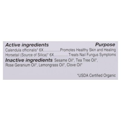 INGREDIENTS: Active Ingredients: *Calendula Officinalis 6X, Promotes healthy skin and healing; *Horsetail (Source of Silica) 6X, Treats nail fungus symptoms. Inactive Ingredients: Sesame Oil (USDA Certified Organic), Tea Tree Oil (USDA Certified Organic), Rose Geranium Oil (USDA Certified Organic), Lemongrass Oil (USDA Certified Organic), Clove Oil (USDA Certified Organic).