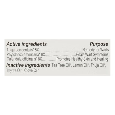 INGREDIENTS: Active Ingredients: *Thuja Occidentalis 8X, Remedy for Warts; *Calendula Officinalis 8X, Heals Wart Symptoms.; *Calendula Officinalis 8X, Heals Wart Symptoms. Inactive Ingredients: Tea Tree Oil (USDA Certified Organic), Lemon Oil (USDA Certified Organic), Thuja Oil (USDA Certified Organic), Thyme Oil (USDA Certified Organic), Clove Oil (USDA Certified Organic).