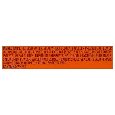 INGREDIENTS: Filtered Water, Vital Wheat Gluten, Expeller Pressed Safflower Oil, Unsulfured Dried Apples, Yeast Extract (Yeast, Salt, Sugar), Wheat Protein Isolate (Wheat Gluten, Trisodium Phosphate, Malic Acid, L-Cysteine), Pure Maple Syrup, Onion Powder, Barley Malt Extract, Garlic, Spices, Sea Salt, Black Pepper, Ground Ginger, Nutmeg, Natural Smoke Flavor.