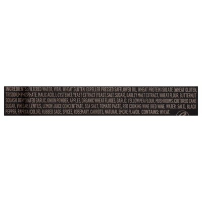 INGREDIENTS: Filtered Water, Vital Wheat Gluten, Expeller Pressed Safflower Oil, Wheat Protein Isolate (Wheat Gluten, Trisodium Phosphate, Malic Acid, L-Cysteine), Yeast Extract (Yeast, Salt, Sugar), Barley Malt Extract, Wheat Flour, Butternut Squash, Dehydrated Garlic, Onion Powder, Apples, Organic Wheat Flakes, Garlic, Yellow Pea Flour, Mushrooms, Cultured Cane Sugar, Vinegar, Lentils, Lemon Juice Concentrate, Sea Salt, Tomato Paste, Red Cooking Wine (Red Wine, Water, Salt), Black Pepper, Paprika (Color), Rubbed Sage, Spices, Rosemary, Carrots, Natural Smoke Flavor.