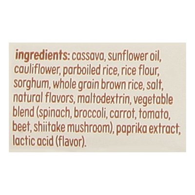 Non-GMO Project verified. nongmoproject.org. Snacks with a plant-based twist. Keepin' it real. Plant based. Veggie packed goodness. Explosion of flavor. Dig in! No puffery here - this is what snack dreams are made of! Turn up the crunch on your cheddar flavored snack game! Hello snack lovers! We like real and more of it! That's why we're keepin' it real with a plant-based twist on all your snack faves. Real veggies, like cauliflower, to give you more of what you love - more flavor, more crunch, and more bites per serving! Talk about a real good snack - more please! Stalks: About 24 per serving. Dig in! FromTheGroundUpSnacks.com. Instagram; Facebook; Twitter: (at)FromTheGroundUpSnacks. Connect with us! Product of USA. < Cassava, Sunflower Oil, Cauliflower, Parboiled Rice, Rice Flour, Sorghum, Whole Grain Brown Rice, Salt, Natural Flavors, Maltodextrin, Vegetable Blend (Spinach, Broccoli, Carrot, Tomato, Beet, Shiitake Mushroom), Paprika Extract, Lactic Acid (Flavor).
