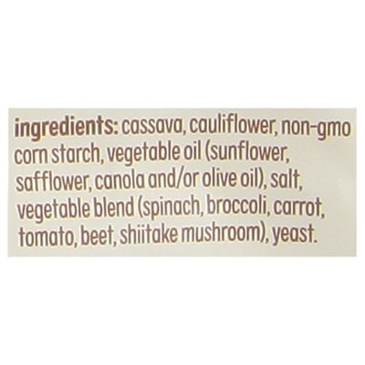 INGREDIENTS: Cassava, Cauliflower, Non-GMO Corn Starch, Non-GMO Expeller Pressed Canola Oil, Salt, Vegetable Blend (Spinach, Broccoli, Carrot, Tomato, Beet, Shiitake Mushroom), Yeast.