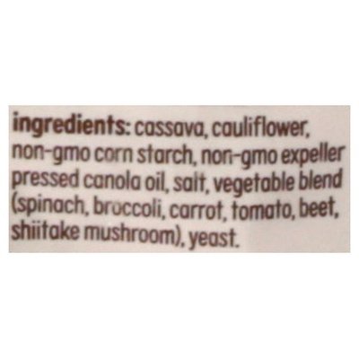 INGREDIENTS: Cassava, Cauliflower, Non-GMO Corn Starch, Non-GMO Expeller Pressed Canola Oil, Salt, Vegetable Blend (Spinach, Broccoli, Carrot, Tomato, Beet, Shiitake Mushroom), Yeast.