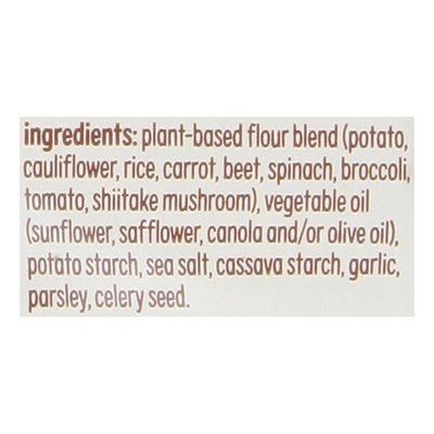 INGREDIENTS: Cassava, Sunflower Oil, Cauliflower, Potato, Brown Rice, Sea Salt, Vegetable Blend (Spinach, Broccoli, Carrot, Tomato, Beet, Shiitake Mushroom), Garlic, Parsley, Celery Seed.