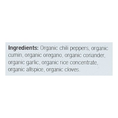 INGREDIENTS: Organic Chili Peppers, Organic Cumin, Organic Oregano, Organic Coriander, Organic Garlic, Organic Ace Concentrate, Organic Allspice, Organic Cloves.