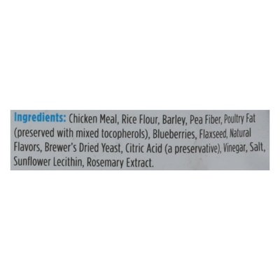 INGREDIENTS: Chicken Meal, Rice Flour, Barley, Pea Fiber, Poultry Fat (Preserved with Mixed Tocopherols), Blueberries, Flaxseed, Natural Flavors, Brewer's Dried Yeast, Citric Acid (a Preservative) Vinegar, Salt, Sunflower Lecithin, Rosemary Extract.