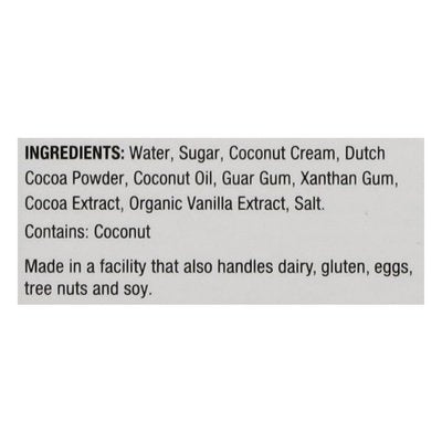 INGREDIENTS: Water, Sugar, Coconut Cream, Dutch Cocoa Powder, Coconut Oil, Guar Gum, Xanthan Gum, Cocoa Extract, Organic Vanilla Extract, Salt.