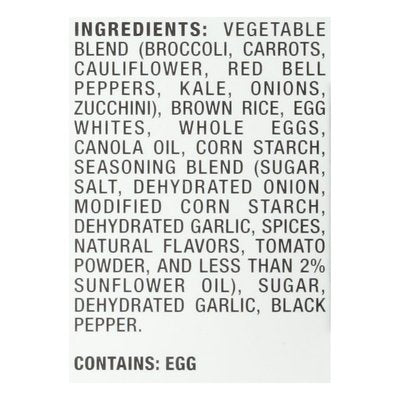 INGREDIENTS: Vegetable Blend (Broccoli, Carrots, Cauliflower, Red Bell Peppers, Kale, Onions, Zucchini), Brown Rice, Egg Whites, Whole Eggs, Canola Oil, Corn Starch, Seasoning Blend (Sugar, Salt, Dehydrated Onion, Modified Cornstarch, Dehydrated Garlic, Spices, Natural Flavors, Tomato Powder, and Less than 2% Sunflower Oil), Sugar, Dehydrated Garlic, Black Pepper.