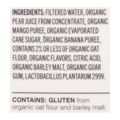 INGREDIENTS: Filtered Water, Organic Pear Juice from Concentrate, Organic Mango Puree, Organic Evaporated Cane Sugar, Organic Banana Puree, Contains 2% or Less of Organic Oat Flour, Organic Flavors, Citric Acid, Organic Barley Malt, Organic Guar Gum, Lactobacillus Plantarum 299v.