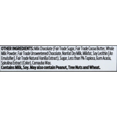 INGREDIENTS: Sleep Blend: Chamomile Flower Extract, Melatonin (2 mg). Other Ingredients: Milk Chocolate (Fair Trade Sugar, Fair Trade Cocoa Butter, Whole Milk Powder, Fair Trade Unsweetened Chocolate, Nonfat Dry Milk, Milkfat, Soy Lecithin [an Emulsifier], Fair Trade Natural Vanilla Extract), Sugar, Less than 1% Tapioca, Gum Acacia, Spirulina Extract (Color), Carnauba Wax.