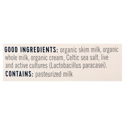 INGREDIENTS: Good Ingredients: Organic Skim Milk, Organic Whole Milk, Organic Cream, Celtic Sea Salt, Live and Active Cultures (Lactobacillus Paracasei).