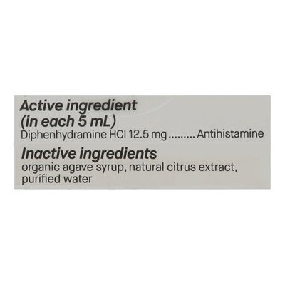 INGREDIENTS: Active Ingredients: Diphenhydramine HCl (12.5 mg), Antihistamine. Inactive Ingredients: Organic Agave Syrup, Natural Citrus Extract, Purified Water.
