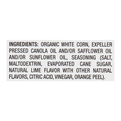 INGREDIENTS: Organic White Corn, Expeller Pressed Canola Oil and/or Safflower Oil and/or Sunflower Oil, Seasoning (Salt, Maltodextrin, Evaporated Cane Sugar, Natural Lime Flavor with Other Natural Flavors, Citric Acid, Vinegar, Orange Peel).