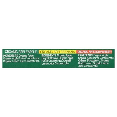 INGREDIENTS: Appleapple: Organic Apple, Organic Apple Puree Concentrate, Organic Lemon Juice Concentrate. Applebanana: Organic Apple, Organic Banana, Organic Apple Puree Concentrate, Organic Lemon Juice Concentrate. Applestrawberry: Organic Apple, Organic Apple Puree Concentrate, Organic Strawberry, Organic Blackcurrant, Organic Lemon Juice Concentrate.